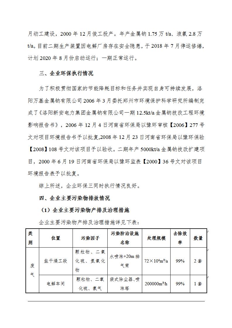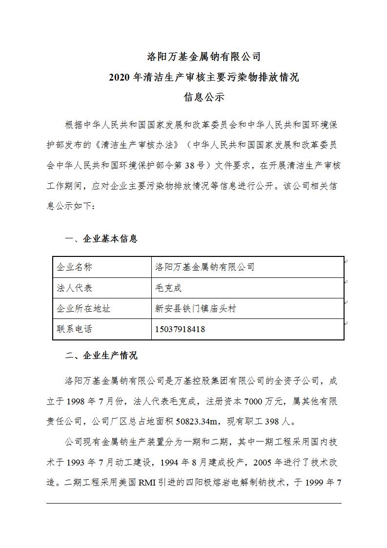 洛陽萬基金屬鈉有限公司2020年清潔生產(chǎn)審核主要污染物排放情況信息公示